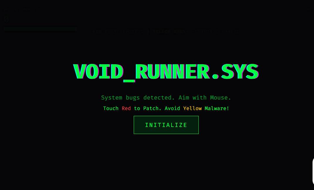 The game is a high-speed, arcade-style "system debugger" where the player controls a ship (the Void Runner) inside a glitching computer kernel. The aesthetic is inspired by classic terminal interfaces and "Matrix-style" digital environments.